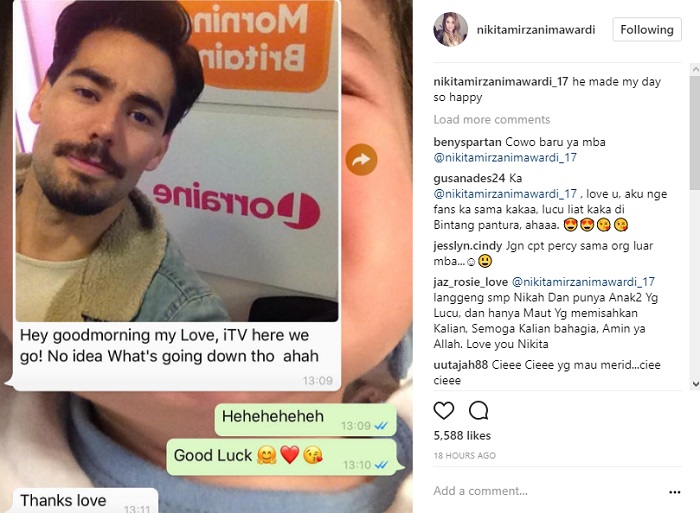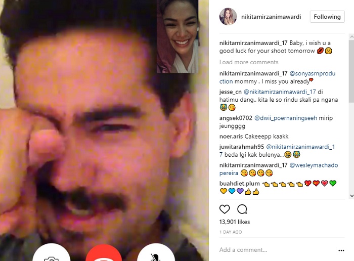 Postingan pertama menampilkan Niki yang tengah melakukan video call dengan pria berkumis. Bahkan, Niki juga mempunyai panggilan sayang untuk pria bule itu. "Baby, i wish u a good luck for your shoot tomorrow," tulis Niki dalam caption postingannya.