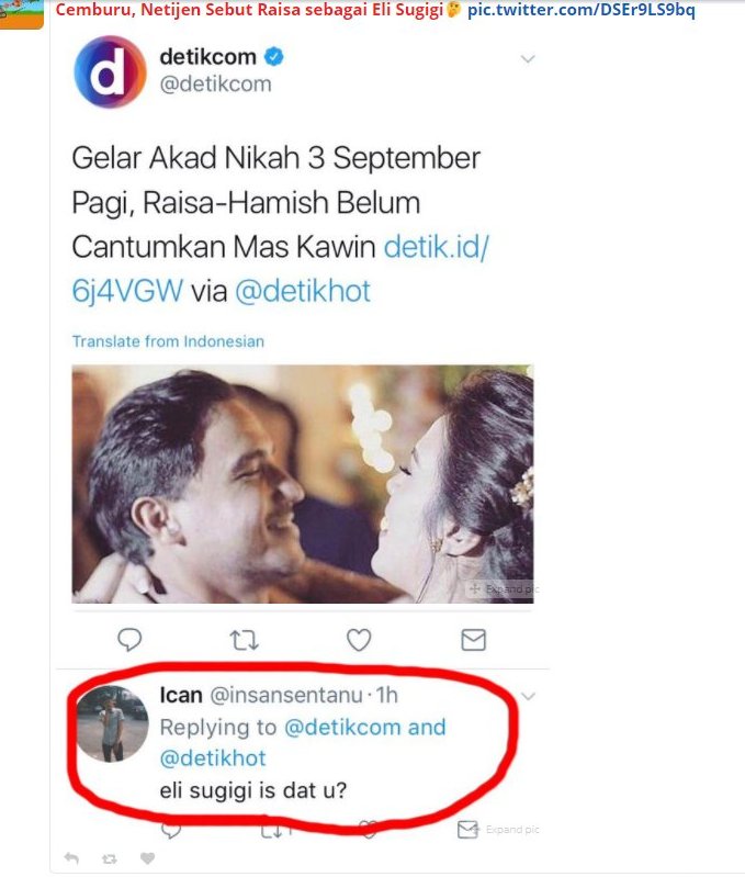 Alih-alih fokus kepada kabar bahagia dari Raisa dan Hamish itu, netizen justru salah fokus ke foto berita. Di situ terpampang foto Raisa dan Hamish yang sedang bertatapan dan berpelukan mesra. Kocaknya, ada seorang netizen dengan akun Twitter @insansentanu fokus ke gigi Raisa. Ia malah menyebut pelantun lagu "Could it Be Love" itu mirip Elly Sugigi.