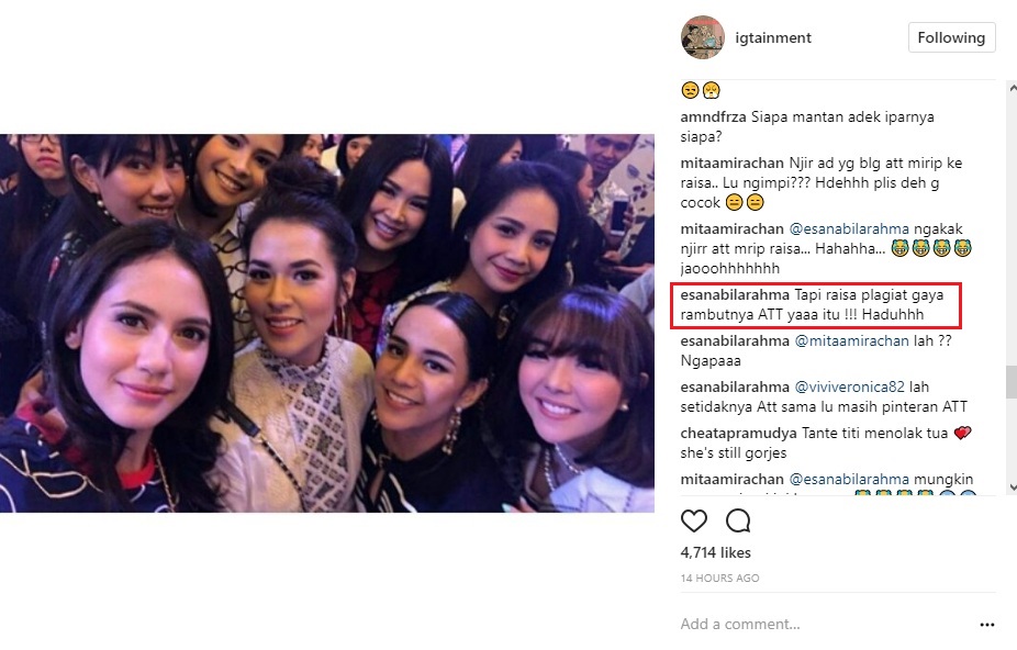Namun, siapa sangka postingan yang diunggah ulang oleh akun @igtainment itu justru malah membuat netizen membahas soal Ayu Ting Ting. "Si @ayutingting92 kx ga diundang sndiri yaa???oohh iyaa beda level yeess uuppss," ujar netizen. "Medonnnaah followers trbanyak ko gk ada ihhhhh... Psti pada ngiri n syirik ma dia kok g diundang..." ujar lainnya. "Mana @ayutingting92 punya temen gk sih?? Perasaan kaya gk punya temen deket yah beda sama nagita .oya @raffinagita1717 jangan sampe ninggalin berlian demi seorang ATT," timpal lainnya.