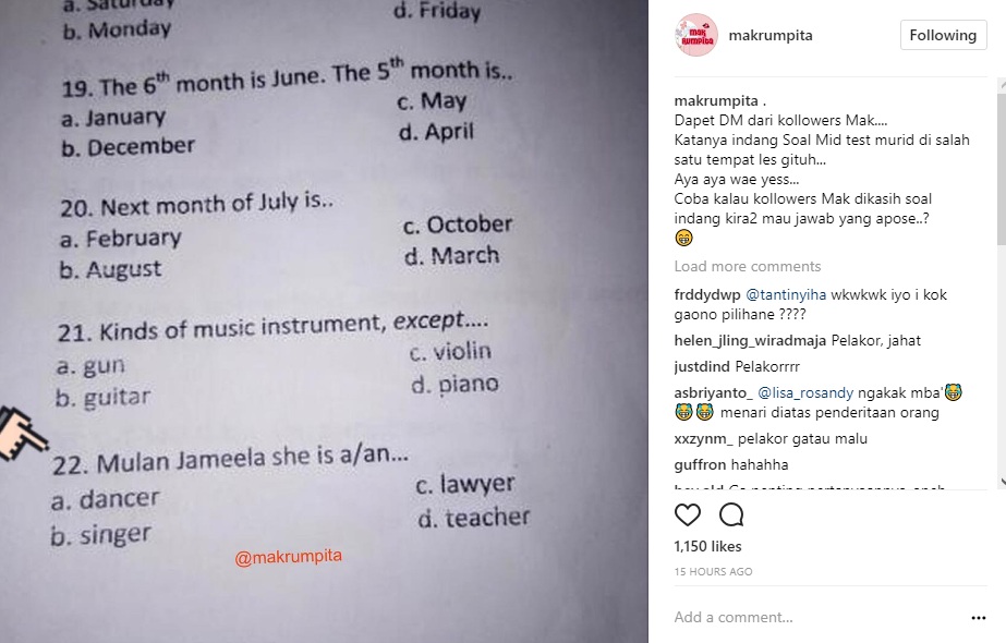 Postingan tersebut sontak membuat netizen heboh. Apalagi, akun gosip @makrumpita meminta netizen untuk ikut menjawab pertanyaan soal Mulan Jameela itu. "Dapet DM dari kollowers Mak.... Katanya indang Soal Mid test murid di salah satu tempat les gituh... Aya aya wae yess... Coba kalau kollowers Mak dikasih soal indang kira2 mau jawab yang apose..?" tulis akun @makrumpita dalam caption postingannya.