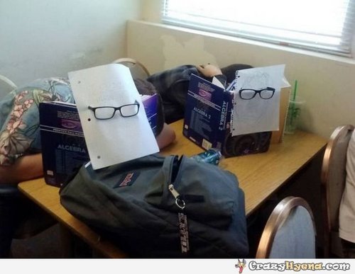 Dua sahabat ini terlihat begitu kompak sedang tidur di kelas saat pelajaran sedang berlangsung. Mereka dengan santainya tidur di meja masing-masing. Agar sang guru tidak curiga, mereka menggambar muka pada sebuah kertas dan memasang kacamata pada kertas tadi.