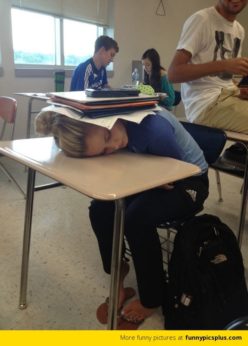 Pelajar cantik ini sedang asyik tertidur pulas di bangkunya. Melihat hal itu, sang teman malah menjahilinya dengan cara menaruh beberapa tumpuk buku tulis dan sebuah kalkulator di atas kepalanya.