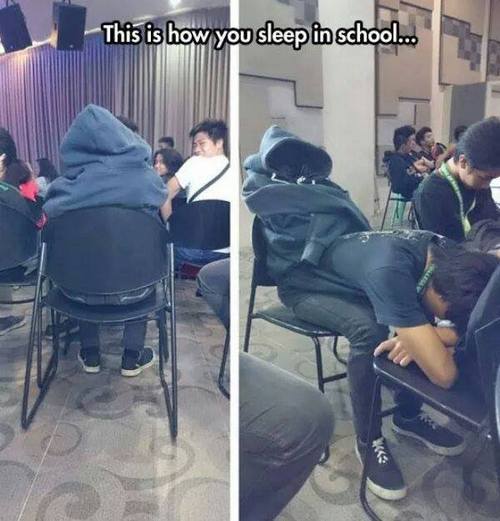 Kamu hanya memerlukan dua kursi dan satu jaket untuk membuat trik tidur di kelas agar tak ketahuan. Kursi-kursi tadi berfungsi untuk tempat tidurmu dan jaket sebagai kamuflase dari pantauan radar sang guru di kelas.