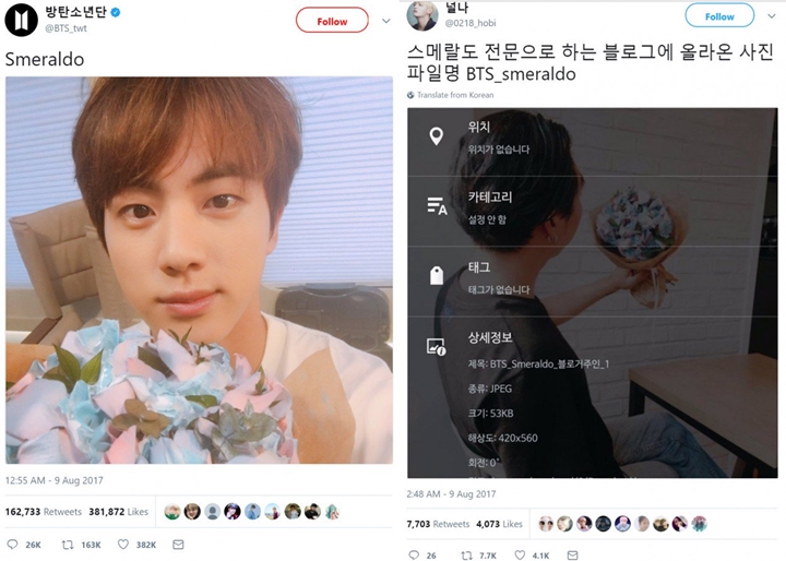 Melalui blog itu, fans menemukan bahwa mereka secara eksklusif telah menamai foto bunga yang ada dengan "BTS_smeraldo". Kode sumber blog tersebut terungkap, dan menunjukkan sesuatu yang mengejutkan. Kode untuk foto "Smelardo" itu tertulis "Bunga Seokjin", yang merupakan nama asli Jin.