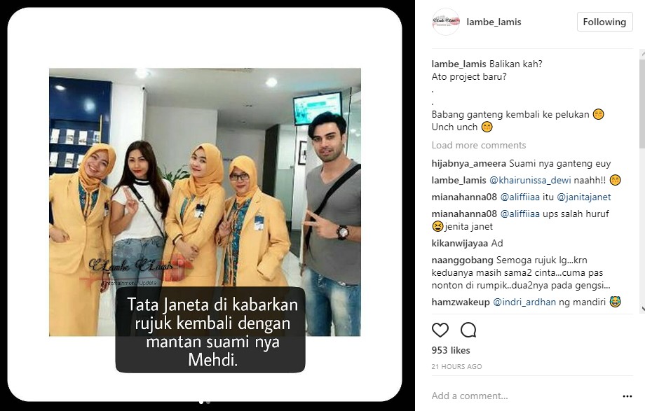 Dalam postingan tersebut, terlihat Tata bersama Mehdi Zati berpose dengan tiga perempuan berhijab mengggunakan busana berwarna kuning. Kebersamaan Tata dan Mehdi itu pun menimbulkan dugaan bahwa keduanya kini telah kembali.