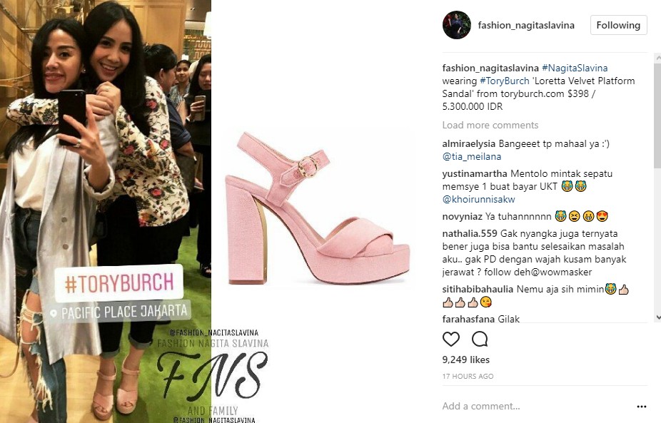 Sementara itu, akun @fashion_nagitaslavina membeberkan harga sepatu cantik milik Gigi. Tak sembarang harga, sepatu bergaya simple itu ternyata mempunyai harga cukup fantastis. "#NagitaSlavina wearing #ToryBurch 'Loretta Velvet Platform Sandal' from toryburch.com $398 / 5.300.000 IDR," tulis akun tersebut dalam caption postingannya.