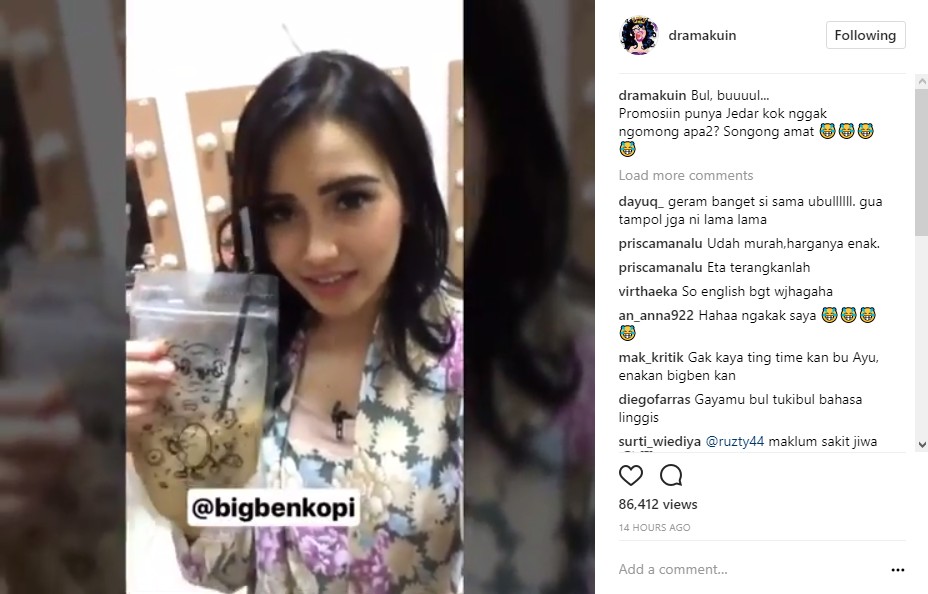 Promosi yang dilakukan Ayu Ting Ting untuk produk minuman kopi Ruben pun dilakukan secara totalitas. Melalui postingan di akun Instagram Story miliknya, Ayu Ting Ting tampak sangat mengagumi kopi Ruben. "This is the first time I tried this. It's very amazing coffe. Bigben, I love you so much. Enak banget, sumpah. Udah murah, trus harganya enak. Uhh, yummy, harus coba," kata Ayu Ting Ting.