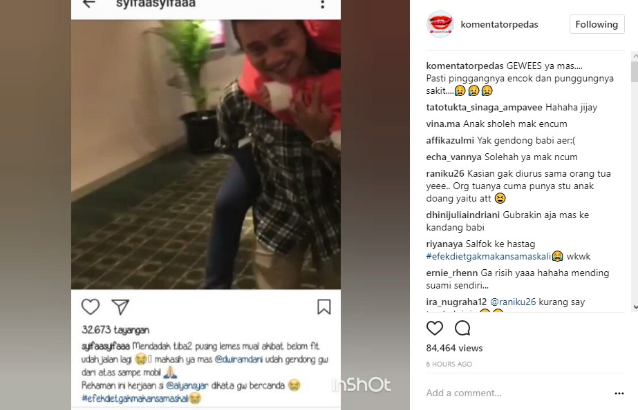 Melalui postingan akun @komentatorpedas, seorang pria terlihat menggendong Syifa di punggungnya. Syifa pun tampak menutupi bagian kepalanya dengan jaket hoody merahnya. Seolah tak ingin saudaranya mengambil gambarnya, Syifa menelungkupkan wajahnya ke punggung sosok pria berpakaian kemeja kotak kotak itu. "GEWEES ya mas....Pasti pinggangnya encok dan punggungnya sakit...." tulis akun @komentatorpedas dalam caption postingannya.