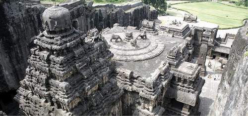 Ellora memiliki lebih dari 100 kuil yang dipahat di dalam gua. Masing-masing menampilkan perpaduan corak arsitektur Buddha, Hindu, dan Jain. Gua keenambelas, salah satu dari 34 gua yang dibuka untuk umum memiliki monumen dari batu tunggal terbesar di dunia, yaitu Kuil Kailasha.