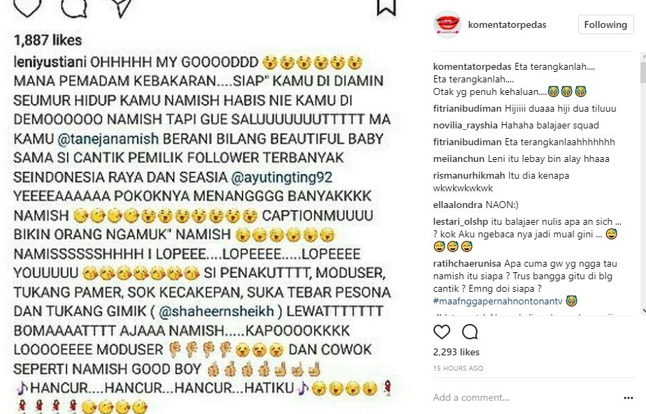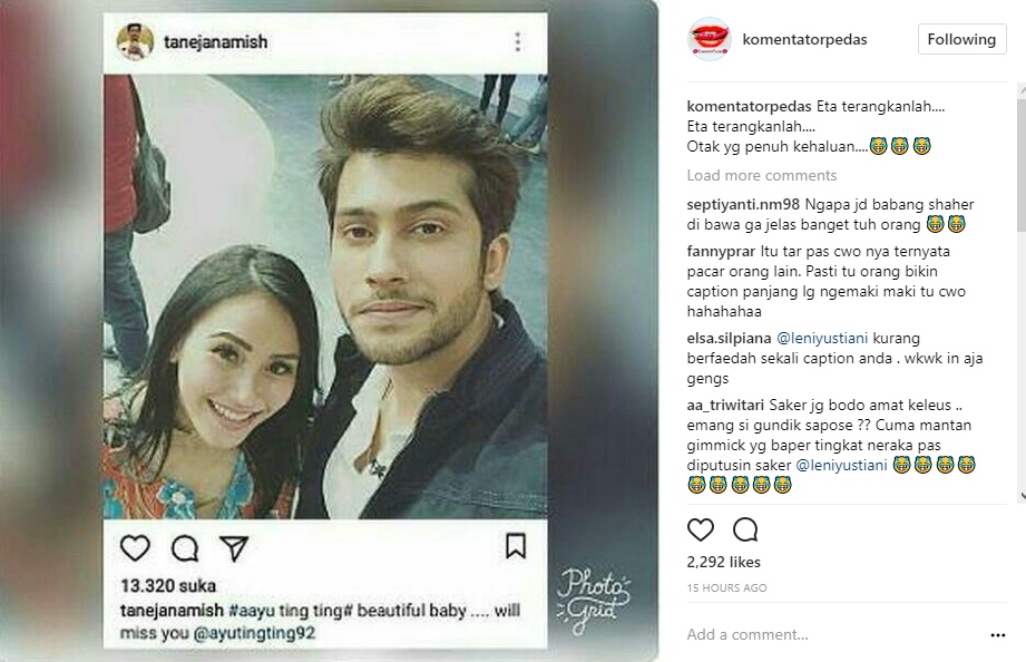 Postingan yang diunggah ulang oleh akun @komentatorpedas itu pun membuat netizen heboh. Apalagi, diketahui seorang fans fanatik Ayu Ting Ting malah menyerang Shaheer Sheikh dengan komentar pedasnya.