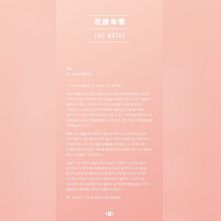 Dalam catatan Seokjin (nama asli Jin) tertulis bahwa Jungkook mengalami kecelakaan. Seperti yang bisa dilihat dalam poster sebelumnya, sang maknae memang nampak duduk di atas kursi roda, dan membuat fans penasaran apa yang membuatnya bisa menjadi seperti itu.