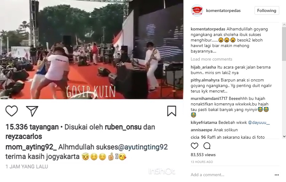 Cuplikan video yang diunggah ulang oleh akun gosip @komentatorpedas sontak membuat netizen heboh. Terlebih goyangan Ayu Ting Ting itu dianggap tak pantas. "Alhamdulillah goyang ngangkang anak sholeha ibuk sukses menghibur....... besok2 leboh hawwt lagi biar makin mehong bayarannya...." tulis akun tersebut melalui caption postingannya.