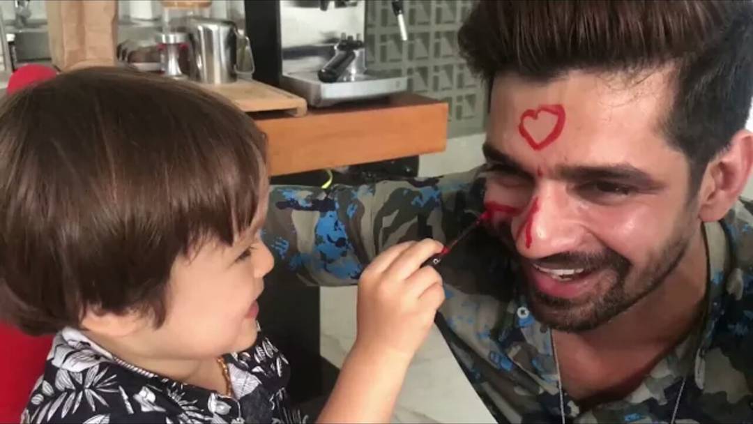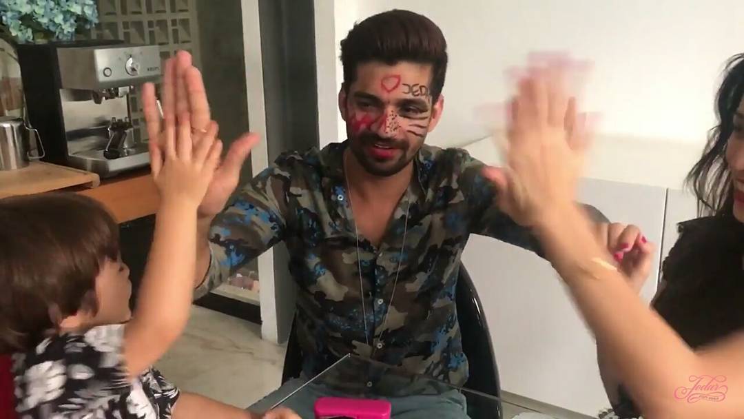 Namun sepertinya dalam acara coret muka ini El Barack mulai nampak nyaman berdekatan dengan Vishal. Bahkan bocah imut itu mau mencoreti wajah sang aktor seperti ini.