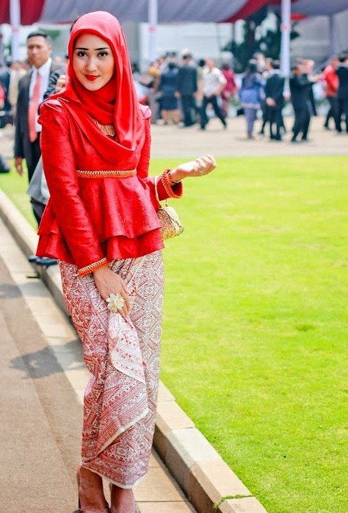 Kamu bisa memadukan kain batik lilit dengan blouse bermodel peplum warna merah seperti yang dipakai Dian Pelangi ini. Pakaian ini ccok digunakan saat menghadiri upacara bendera 17 Agustus, atau acara resmi bertema Agustusan lainnya.