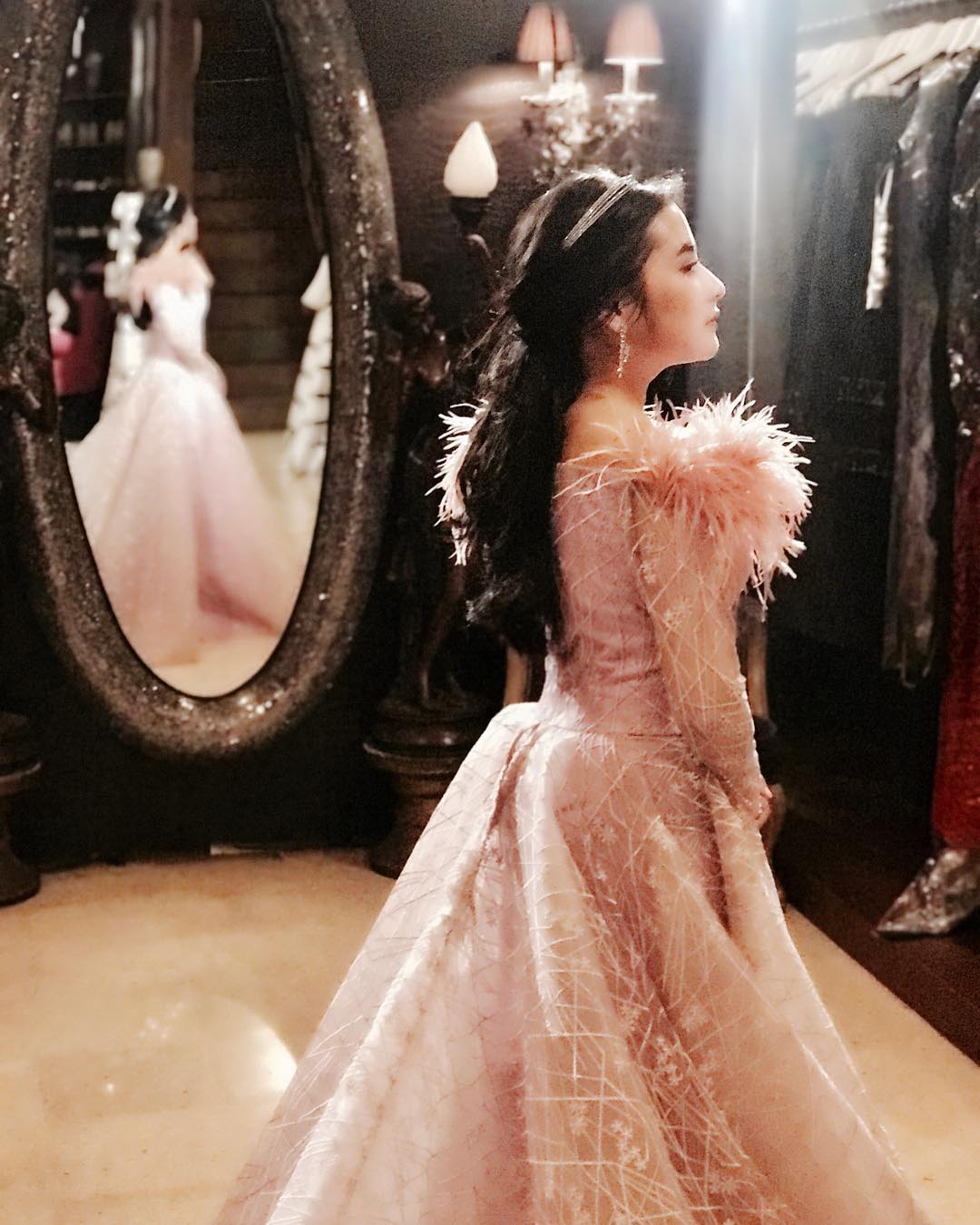 Gaun berwarna pink pastel yang dihiasi renda di bagian bahu ini sukses membuat kagum!