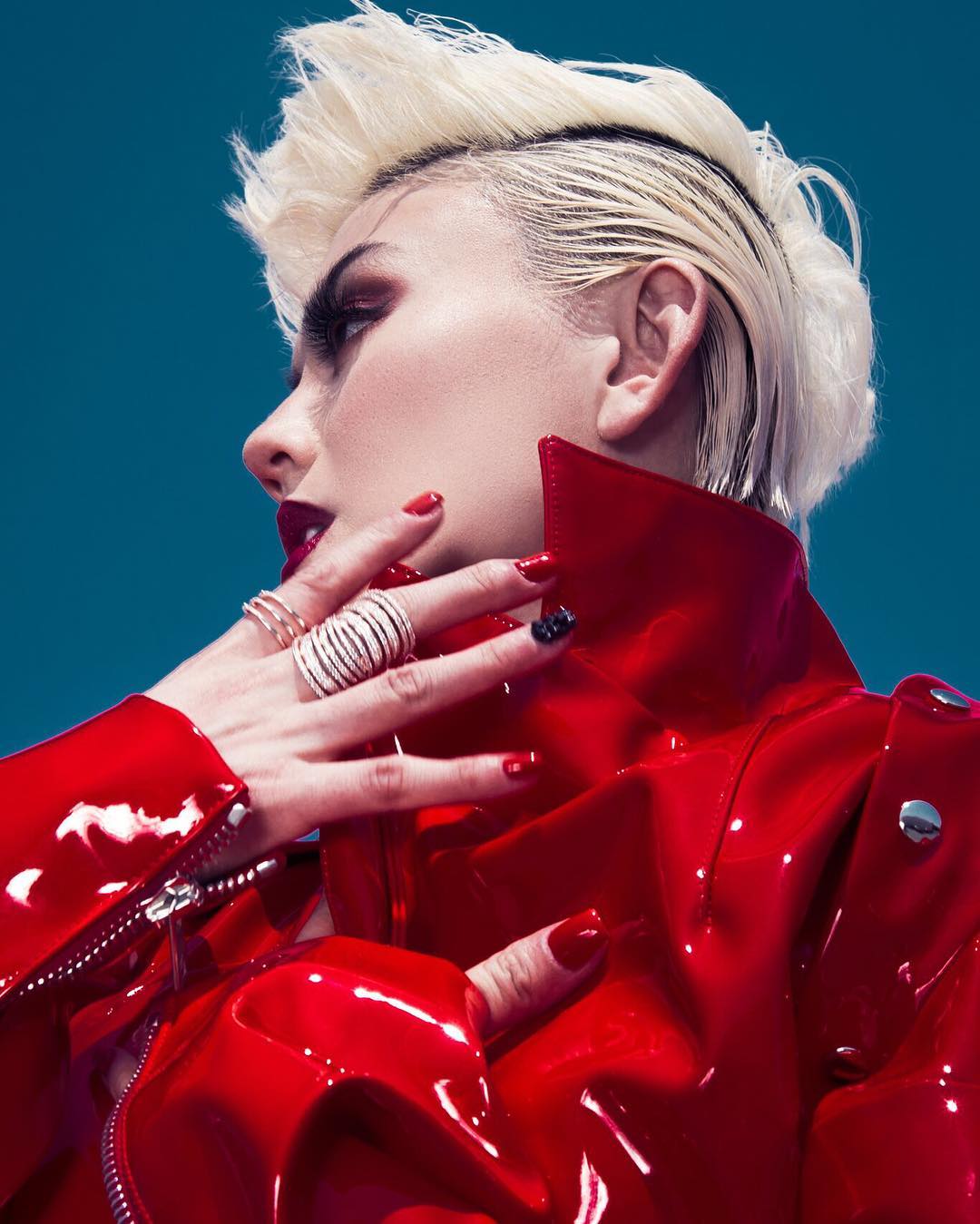 Lipstik merah menyala dengan tatanan rambut super keren yang dicat putih, begini tampilan Agnes Monica yang disebut mirip Katy Perry.