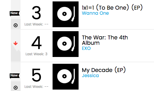 Sementara itu, Wanna One yang baru saja memulai debutnya resminya dengan sebuah mini album bertajuk "1×1=1 (TO BE ONE)", juga sukses memulai debutnya di chart album dunia Billboard dengan masuk di posisi ke-3. Posisi ke-4 ditempati oleh EXO dengan album "The War" mereka yang telah menduduki chart ini selama empat minggu lamanya.