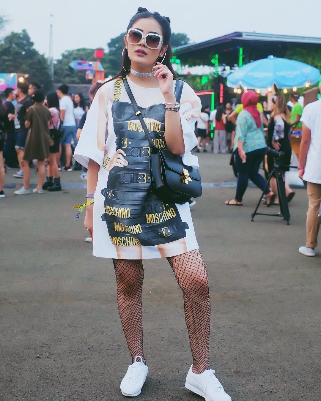 Kabarnya busana oversized tee dari Moschino yang Nindy kenakan ini berharga sekitar Rp 15 juta rupiah, lho!