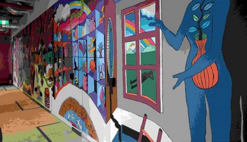 Terdapat koridor panjang yang dihiasi mural karya Agung Prabowo di kantor Facebook Indonesia. Mural ini menggambarkan kedamaian dan perbedaan dengan elemen-elemen dari budaya Indonesia.