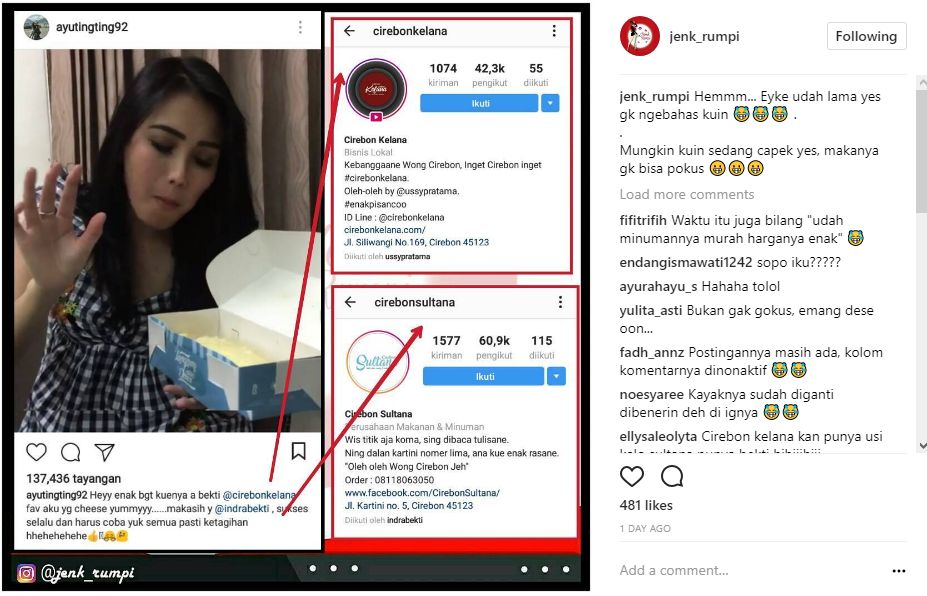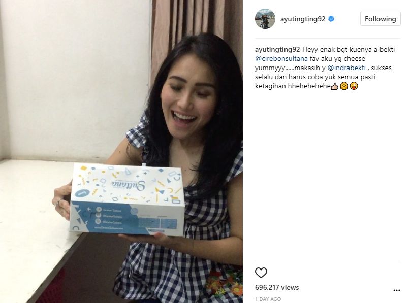 Melalui keterangan postingan di akun Instagram pribadinya, Ayu Ting Ting malah mempromosikan kue kekinian milik Ussy Sulistiawaty, yakni Cirebon Kelana. "Heyy enak bgt kuenya a bekti @cirebonkelana fav aku yg cheese yummyyy......makasih y @indrabekti , sukses selalu dan harus coba yuk semua pasti ketagihan hhehehehehe," tulis Ayu dalam caption postingannya.