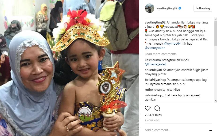 Karena pakaian adat itu, Bilqis akhirnya berhasil menjadi juara pertama. Didampingi sang nenek, Umi Kalsum, Bilqis pun tampak memamerkan piala kemenangannya itu sambil tersenyum lebar. "Alhamdulillah bilqis menang y juara yeeeaaaa .....selamat y nak, bunda bangga sm iqis, semangat n pinter trs yah nak.....love you kritingnya bunda....bilqis pake baju adat Bali mksh nenek @qymbe64 nih bay @victorysalon," tulis Ayu Ting Ting tak menghentikan ucapan syukurnya.