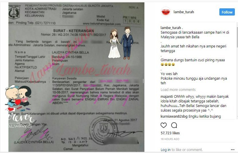 Kanal247.com - Kabar pernikahan Laudya Cynthia Bella yang menjadi heboh lantaran digelar di Malaysia, akhirnya terjawab sudah. Beredar viral termasuk di akun gosip Instagram, bukti surat pernikahan Bella terungkap. Sebelumnya, Bella santer dikabarkan akan segera menikah pada pertengahan bulan September mendatang. Artis cantik itu dinikahi oleh duda keren asal Malaysia, Engku Emran di Negeri Jiran. Sayang sejak kabar ini muncul, Bella belum memberikan klarifikasi resmi.