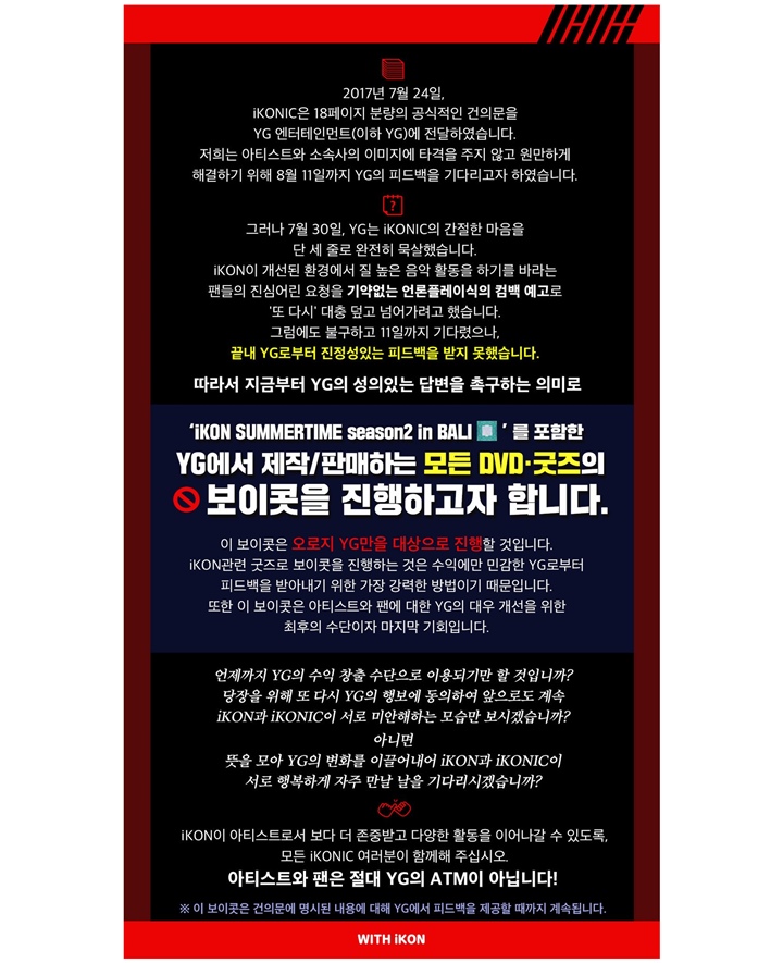 Akibat dari kekecewaan itu justru berbuntut cukup mengejutkan. Fans memutuskan untuk memboikot DVD baru idolanya "iKON SUMMERTIME SEASON 2 in BALI" dan semua barang lain yang diproduksi oleh perusahaan sampai YG memberikan feedback yang lengkap.