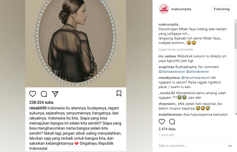 Seperti diketahui, banyak para selebritis yang memang turut menyambut HUT Republik Indonesia, termasuk Raisa. Melalui akun Instagram pribadinya, Raisa pun memberikan ungkapan cintanya pada Nusantara. "Indonesia itu alamnya, budayanya, ragam sukunya, sejarahnya, senyumannya, hangatnya, dan rakyatnya. Indonesia itu kita. Siapa yang bisa memajukan bangsa ini selain kita sendiri? Siapa yang bisa mengharumkan nama bangsa selain kita sendiri? Sekali lagi, jangan sibuk saling menyalahkan, lakukan saja yang terbaik untuk bangsa kita, dan saksikan kebangkitannya Dirgahayu Republik Indonesia!" tulis Raisa dalam caption postingannya.