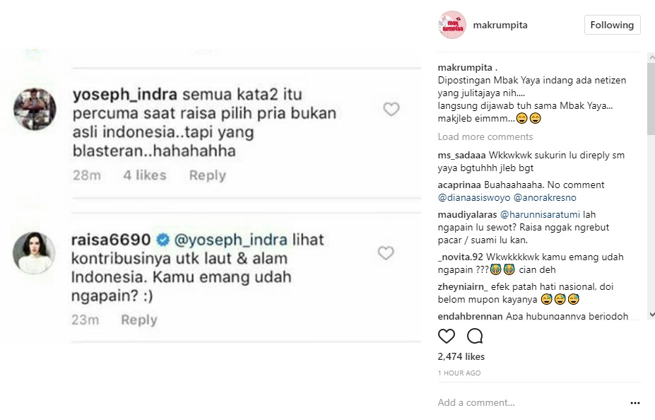 Namun, tanggapan fans Raisa malah menyimpang dari postingan tersebut. Ia malah menyebut kata-kata itu tak ada gunanya, terlebih Raisa lebih memilih pria dengan wajah bule seperti Hamish. "Semua kata2 itu percuma saat raisa pilh pria bukan asli indonesia..tapi yang blasteran..hahahahha," tulisnya.