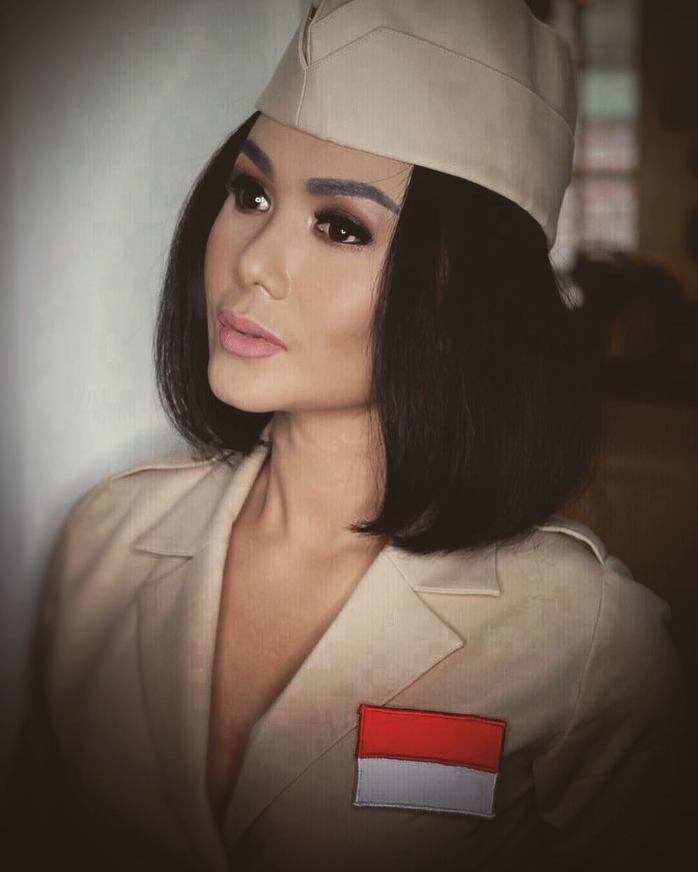 Bukan upacara, Yuni Shara berdandan ala pejuang jaman dahulu lengkap dengan tanda merah putih seperti ini.