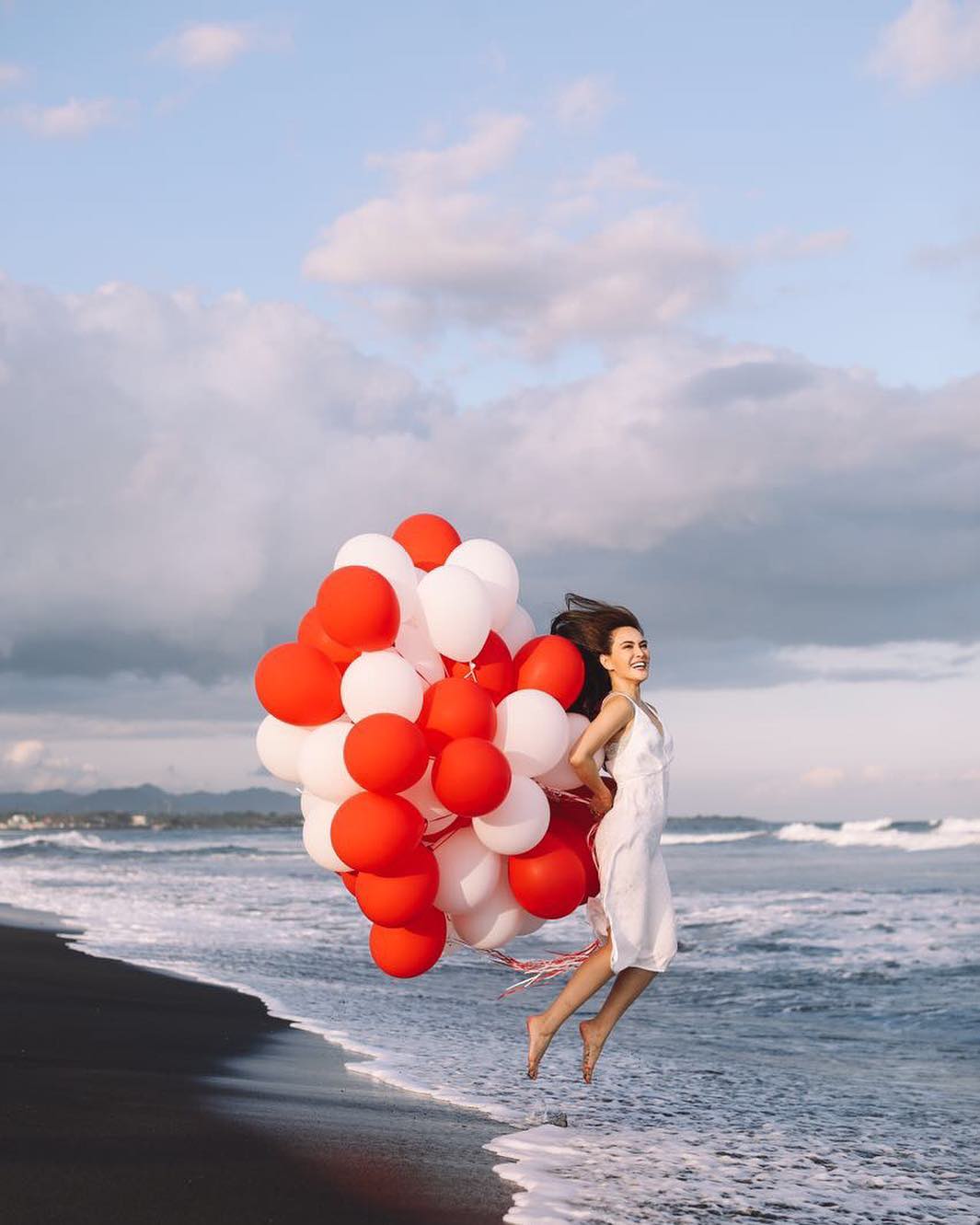 Shandy Aulia ternyata juga melakukan pemotretan di sebuah pantai lengkap dengan balon merah putih.