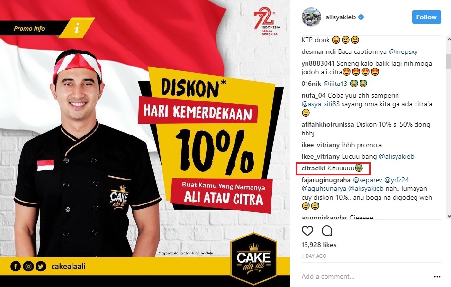 Syarat unik pun diberikan untuk mendapatkan promosi berbatas waktu itu. Khusus bagi pelanggan bernama Ali atau Citra, adik kandung Nabila Syakieb itu akan memberlakukan potongan harga. "Hi! Dalam rangka memeriahkan hari Kemerdekaan Republik Indonesia, Ali mau kasih kamu diskon 10% untuk yang namanya "Ali" atau "Citra" yang tercetak di KTP kamu. Hal ini juga untuk memeriahkan PERJUANGAN Ali di bulan Agustus ini! (Ali Syakieb)," tulis Ali dalam keterangan postingannya.