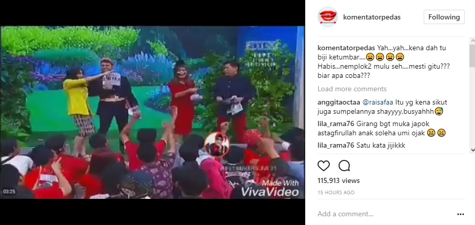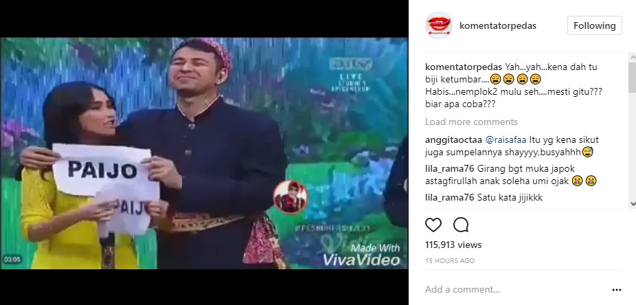 Melalui postingan akun @komentatorpedas, diketahui Ayu Ting Ting dan Raffi Ahmad tengah melakukan adegan di variety show "Pesbukers". Tak hanya berdua, di panggung yang telah disediakan pun Eko Patrio dan Vega Darwanti ikut menghibur penonton.