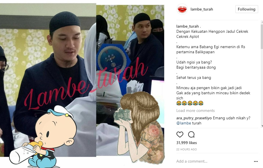 Dalam postingan tersebut, tampak Egi tengah menunggu antrean di rumah sakit. Berbalut busana hitam kompak dengan sang istri bercadarnya, Egi rupanya tak sadar jika seseorang telah memotretnya.