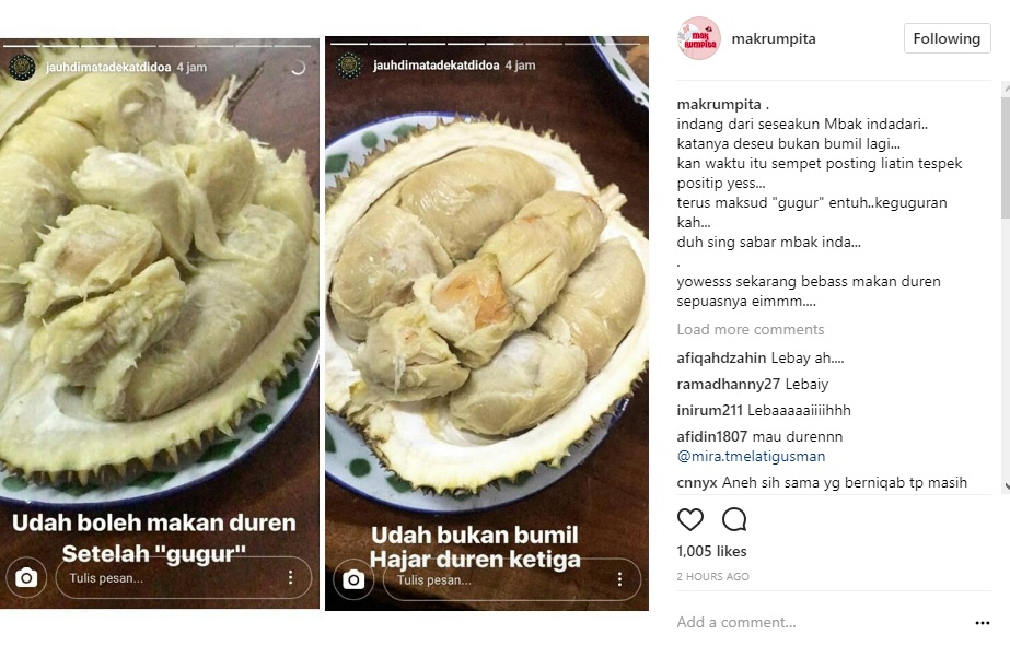 Dalam postingan lainnya, tampaknya Indadari tak terlihat sedih usai kehilangan sang buah hati. Indadari malah menunjukkan durian ketiga yang tengah dinikmatinya. Tak lupa pula mention dilayangkan pada Umi Pipik, istri mendiang Ustadz Jeffry Al Buchori. "Ya, ini duren ketiga. Umi, elo kaga jadi ikutan. Gue ngeduren deh," katanya dengan nada ceria.