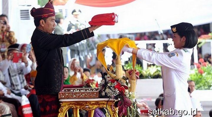 Meski mengingat sebagai besar urutan dan prosesi, Jokowi rupanya sempat kebingungan saat harus mengambil Bendera Merah Putih dari Paskibra. Ia bahkan mengaku sempat berbisik-bisik dengan pembawa baki Merah Putih, Ruth Cheline Eglesya Purba.