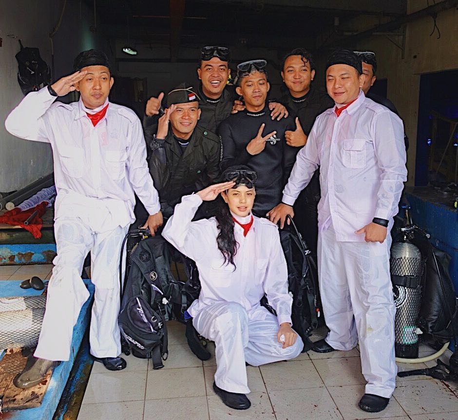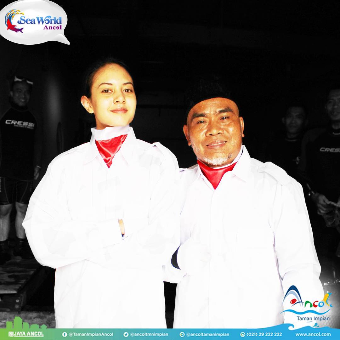 Lengkap dengan pakaian ala pengibar bendera, Aurelie Moeremans didampingi oleh tim diver dari Sea World, Ancol.