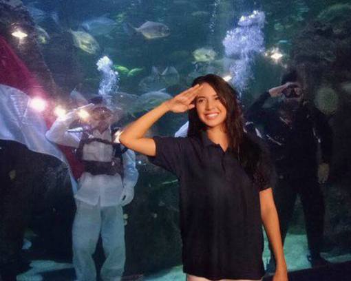 Aurelie Moeremans menjadi salah satu pasukan pengibar bendera bawah air di Seaworld Ancol.