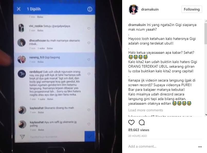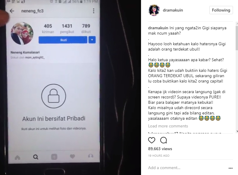 Hal tersebut bermula ketika akun @dramakuin mengunggah video soal salah satu haters Gigi itu. Dalam postingan itu, rupanya akun Neneng diikuti oleh ibu Ayu Ting Ting, Umi Kalsum. "Ini yang ngata2in Gigi siapanya mak ncum yaaah? Hayooo looh ketahuan kalo hatersnya Gigi adalah orang terdekat ubul!!" tulis akun tersebut dalam caption postingannya.