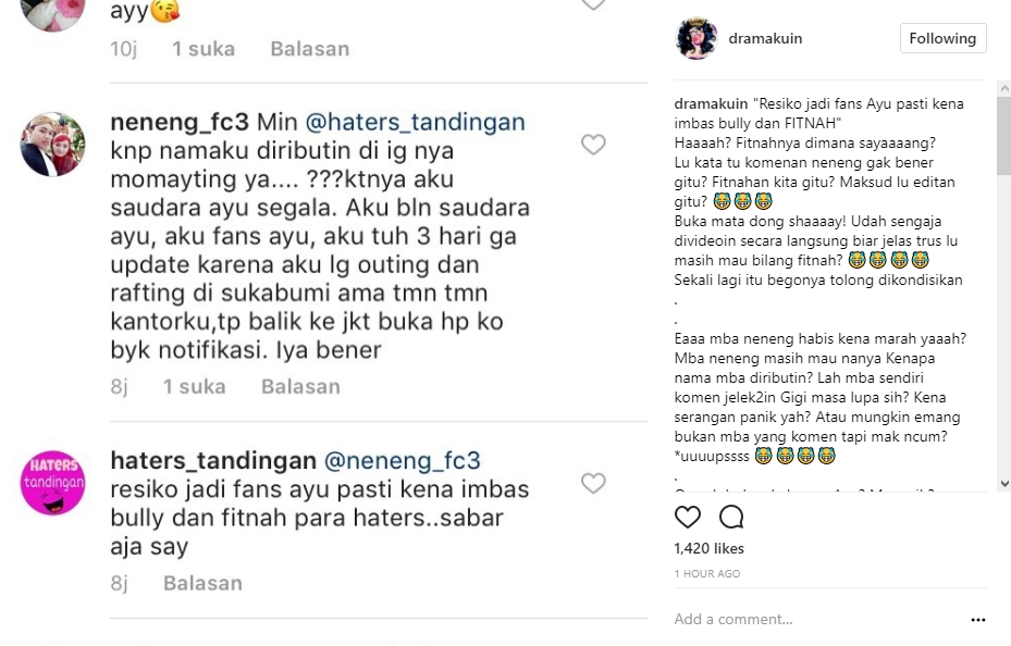 Mengetahui hal tersebut, netter tetap meyakini jika haters Nagita dekat dengan keluarga Ayu Ting Ting. "Hater nagita fix adalah fans japok dinaungin sama keluarga japok. Masa si neneng doang difollow ncum wkwkkw," kata netizen. "Kasian ayu gx d akui saudaranya sendiri," kata lainnya. "Wkwkwkk..mbak neneng panikk akutt..abis dimarahin tukang laknat,jd sok poloss padahal bushuukk," timpal lainnya.