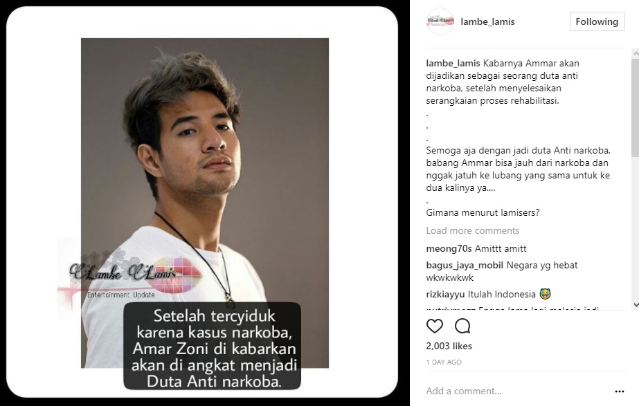 Tak disangka, muncul kabar mengejutkan lagi soal aktor 24 tahun itu. Kabarnya, Ammar Zoni akan dijadikan sebagai duta anti narkoba usai menyelesaikan serangkaian proses rehabilitasi. "Kabarnya Ammar akan dijadikan sebagai seorang duta anti narkoba, setelah menyelesaikan serangkaian proses rehabilitasi. Semoga aja dengan jadi duta Anti narkoba, babang Ammar bisa jauh dari narkoba dan nggak jatuh ke lubang yang sama untuk ke dua kalinya ya...." tulis akun gosip @lambe_lamis dalam keterangan postingannya.