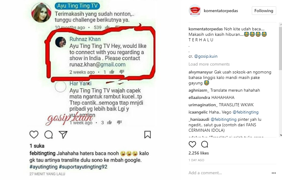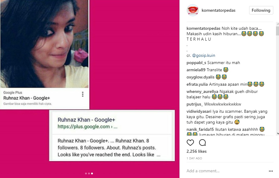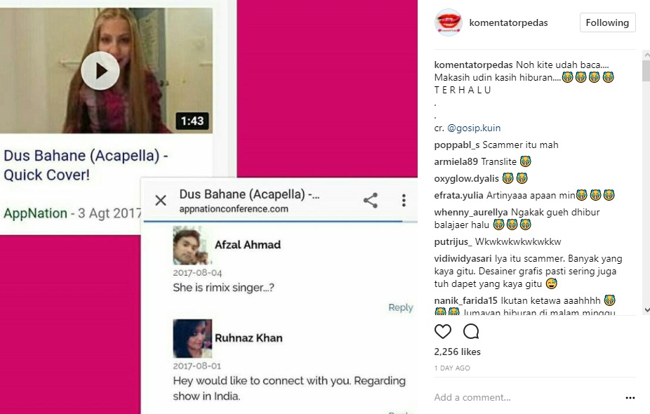 Namun, siapa sangka ajakan wanita India itu tak hanya pada Ayu Ting Ting. Bahkan, tampaknya wanita bernama Ruhnaz Khan itu adalah seorang penipu. Pasalnya, tak banyak informasi soal wanita itu. "Noh kite udah baca.... Makasih udin kasih hiburan.... T E R H A L U," tulis akun @komentatorpedas dalam caption postingannya.