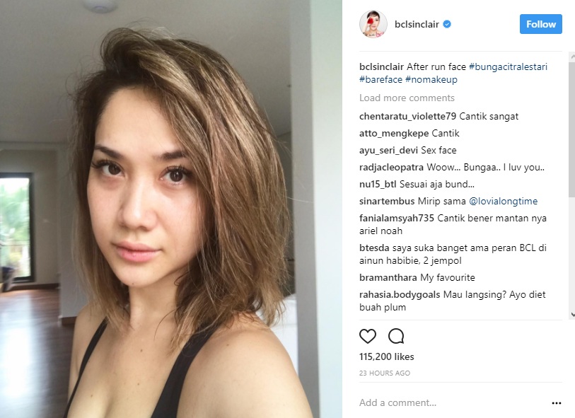 Rupanya, penampilan Bunga saat itu ditunjukkan usai melakukan rutinitasnya usai berolahraga. "After run face #bungacitralestari #bareface #nomakeup," tulis Bunga dalam caption postingannya.