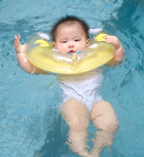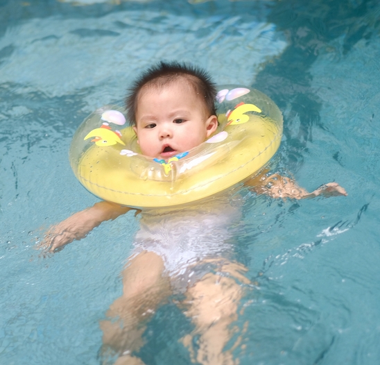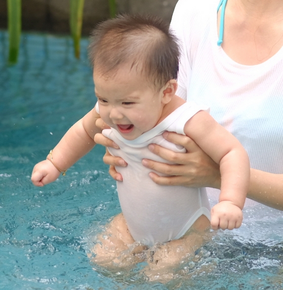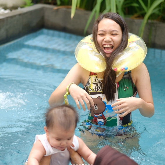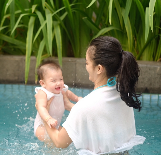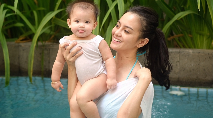 Ririn mengajari anak keduanya berenang. Dia tahu bahwa sang anak suka sekali bermain air.