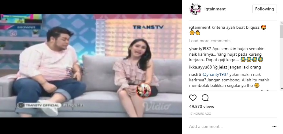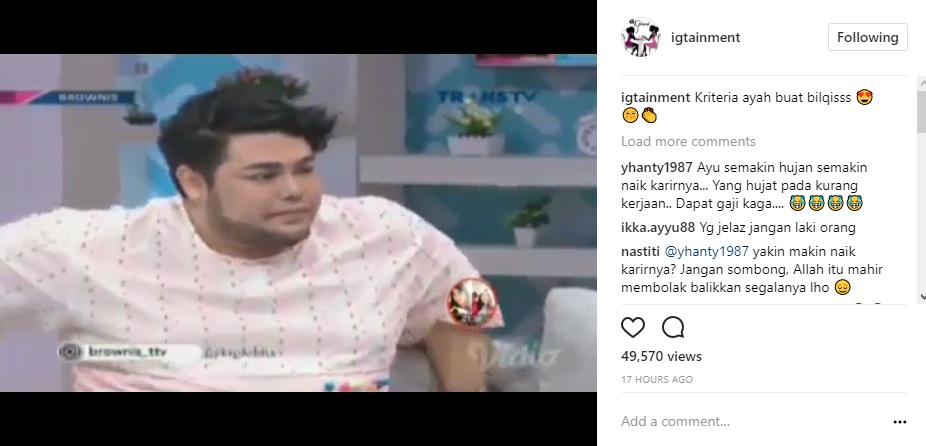 Mengetahui pernyataan Ayu soal kriteria ayah Bilqis, netizen malah melayangkan cibiran pada pelantun "Sambalado" itu. "sok manis banget," ujar netizen. "Kbnykan milih ini itu akhirnya awet jdi janda," ujar lainnya. "Igun ngapain sih kejar2 dia. Kayak gak ada yg laen aja," timpal lainnya.