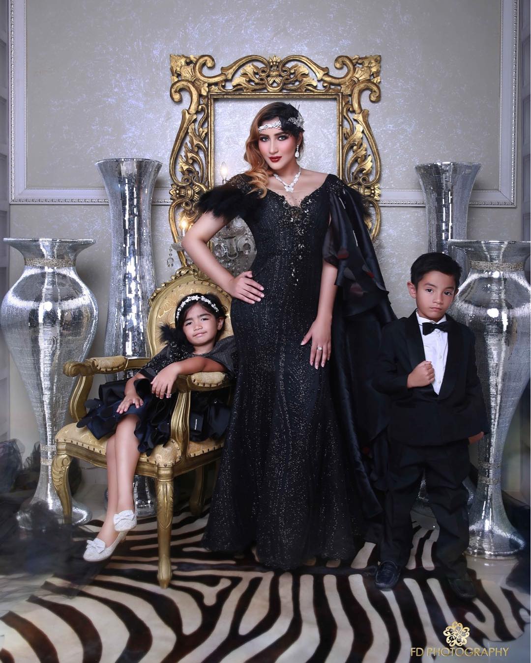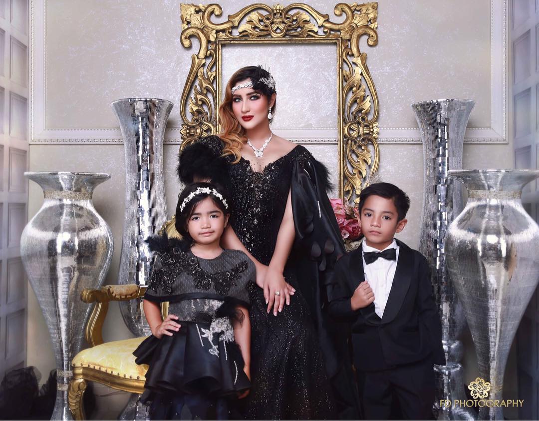 Ia melakukan pemotretan bersama kedua buah hatinya yang tampil senada dengan setelan hitam.