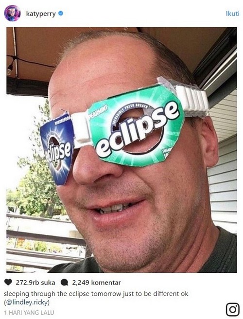 Tak mau kelewatan momen langka gerhana matahari total, Katy Perry rela tidur lebih awal dari biasanya.