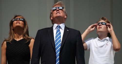 Presiden Amerika Serikat, Donald Trump pun turut menyaksikan momen gerhana matahari total dari balkon gedung putih. Dengan mengenakan kacamata khusus, Trump beserta istri dan anaknya terlihat menatap ke langit saat matahari, bulan dan bumi berada dalam satu garis lurus.
