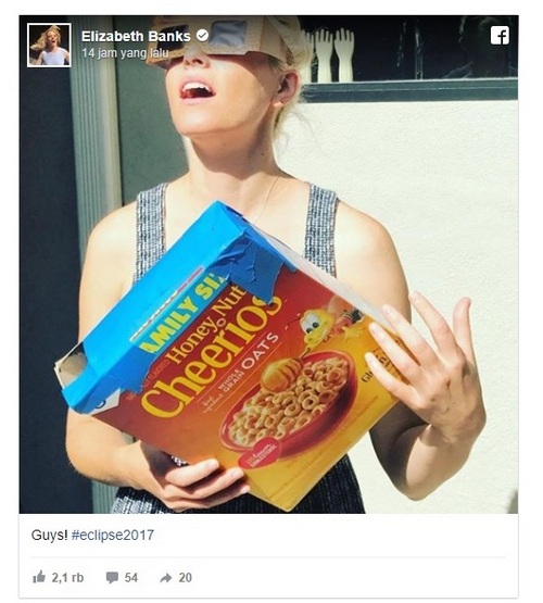 Aktris Hunger Games, Elizabeth Banks juga tak mau kalah berbagi momen langka ini. Lewat akun medsosnya, Elizabeth menunjukkan kotak sereal yang ia rancang khusus untuk melihat gerhana matahari total.