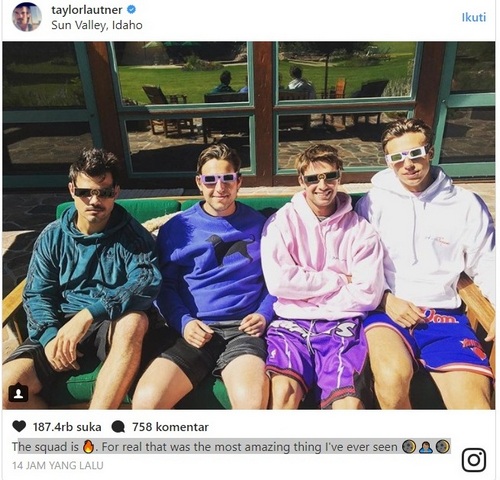 Aktor yang dikenal memerankan Jacob Black di film "Twilight", Taylor Lautner, juga tak mau ketinggalan momen gerhana matahari total. Bersama gengnya. Ia mengaku telah melihat hal paling menakjubkan di hidupnya.